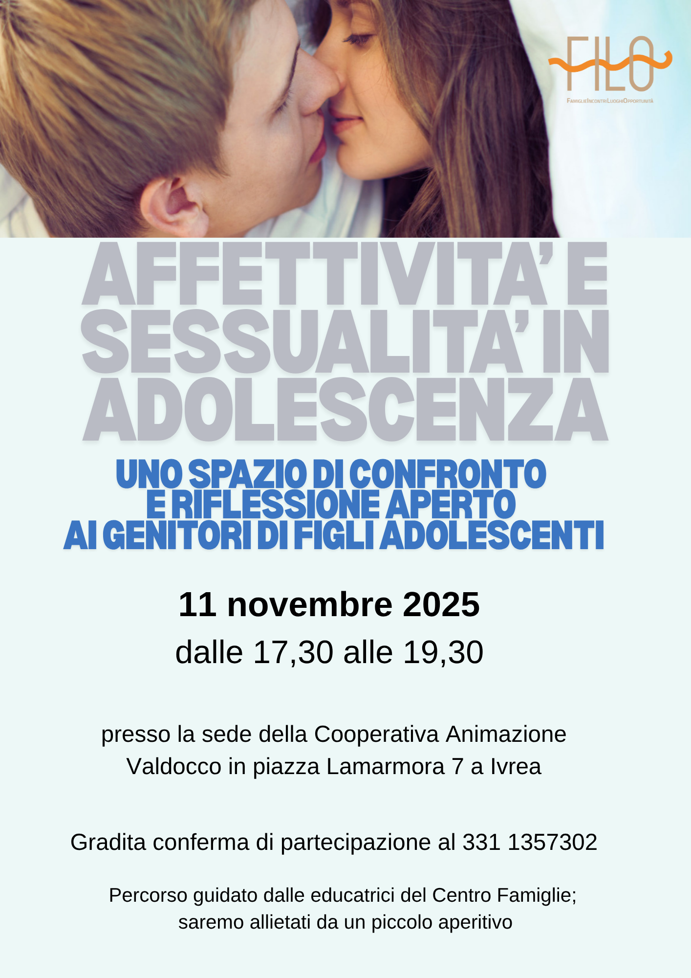 l'11 novembre prenderà avvio un breve ciclo di incontri rivolto a genitori di figli adolescenti sul tema "Affettività e sessualità in adolescenza".
