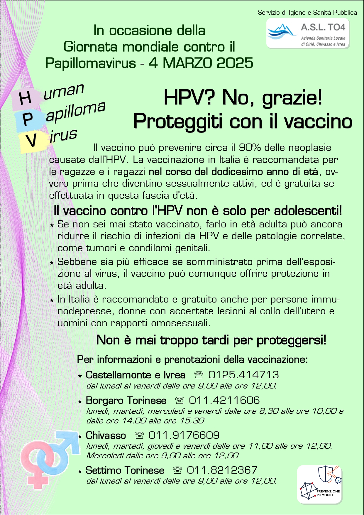 L'A.S.L. TO4 ricorda che è il vaccino per l'HPV non è solo per adolescenti ma è possibile vaccinarsi contro tale virus anche in età adulta.