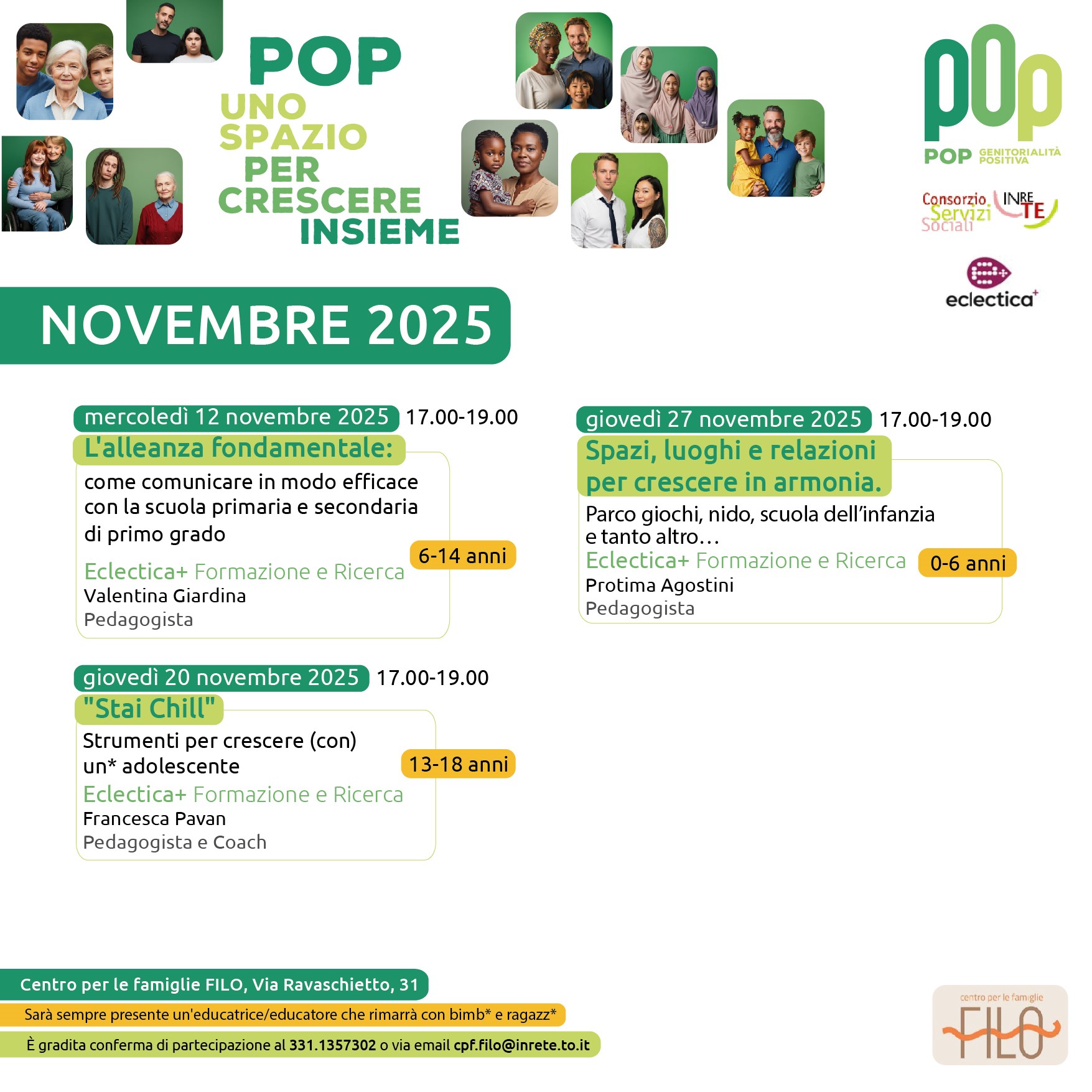 Mercoledì 12 novembre dalle 17.00 alle 19.00 "L'alleanza fondamentale. Come comunicare in modo efficace con la scuola primaria e secondaria di primo grado" (per genitori con figli 6-14 anni); giovedì 20 novembre "Stai Chill. Strumenti per crescere (con) un*adolescente" (per genitori con figli 13-18 anni); giovedì 27 novembre "Spazi, luoghi e relazioni per crescere in armonia" (per genitori con figli 0-6 anni).